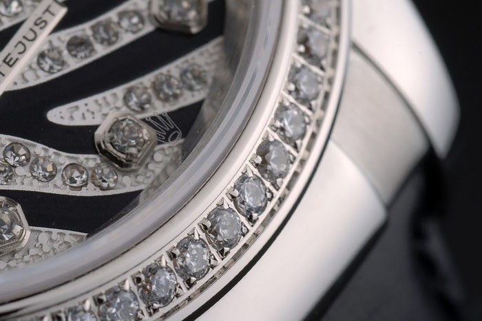 Una de las características más destacadas de este reloj es su movimiento cinético automático, que asegura una precisión excepcional. Equipado con el prestigioso calibre suizo ETA, el Swiss Rolex Datejust 80252 es sinónimo de calidad y fiabilidad. Además, su bisel de acero inoxidable pulido con incrustaciones de diamantes añade un toque de lujo que lo convierte en una pieza única. La correa de cuero de cocodrilo negro, con el logotipo de Rolex grabado en el clasp de acero inoxidable, refleja el compromiso de la marca con la artesanía de alta gama.