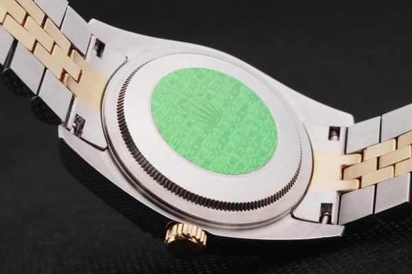 La caja del reloj es de acero inoxidable sólido cepillado, con un grosor de 12 mm y un innovador diseño de forma barrel. Esto no solo le da un aspecto robusto, sino que también garantiza comodidad para el uso diario. Además, el bisel pulido y cortado con precisión hace que el reloj brille a la luz, perfecto para quien busca un toque de lujo sin el alto costo. Con unas dimensiones de 44 x 36 mm, el Rolex Day-Date se adapta perfectamente a la muñeca masculina. Para quienes disfrutan de un diseño aún más exclusivo, este modelo está disponible en versiones con diamantes, atrayendo a quienes buscan un «diamond encrusted rolex» que haga una declaración.